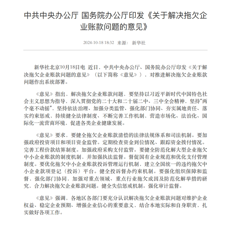 中共中央办公厅 国务院办公厅印发《关于解决拖欠企业账款问题的意见》-k8凯发天生赢家一触即发