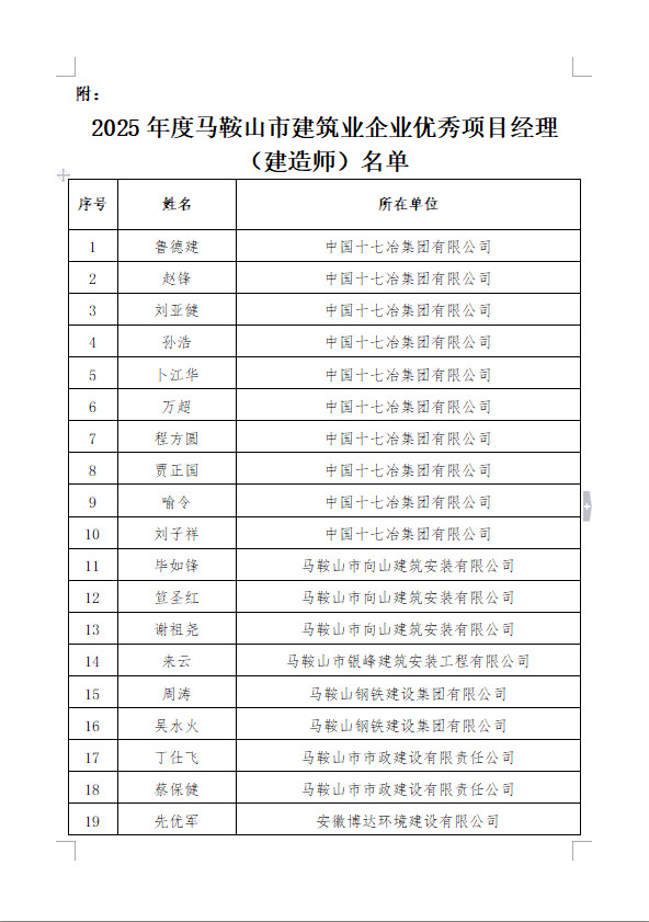 正式文件(可下载)——关于公布2025年度马鞍山市建筑业企业优秀 项目经理(建造师)名单的通知